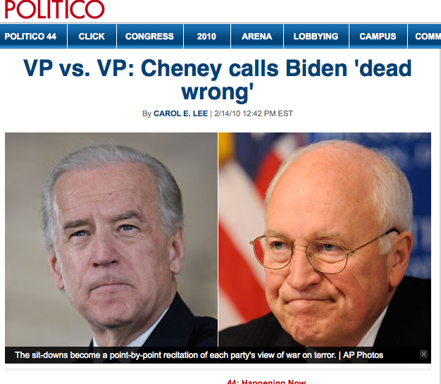 Susie Madrak Sunday Feb 14, 2010 10:00amIn the politest possible way, Joe Biden tells David Gregory on "Meet the Press" that Dick Cheney is a lying bag of dog doo in his attacks on how the Obama administration is handling terrorism. Cheney appeared this morning on "This Week", clearly laying the groundwork to blame the Obama administration in the case of another terrorist attack. Why do I get the feeling he's actually rooting for one?